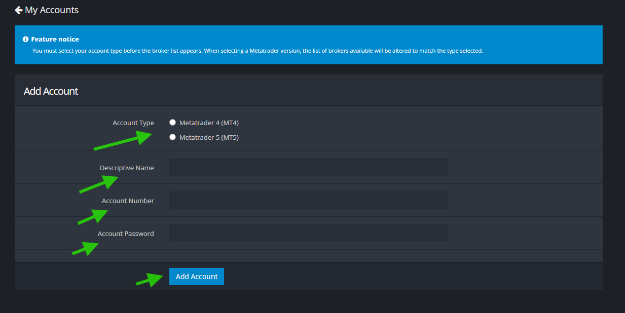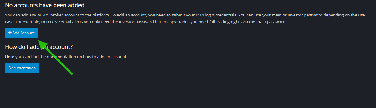 copyAi trading allows you to manage an unlimited amount of MT4 or MT5 accounts from any MT4 or MT5 broker, all from one platform. There is no special software, no complex configurations and no VPS servers required. Simply upload your account credentials to the platform and your accounts will be hosted securely in the cloud 24/7. Once you have accounts added you can utilise the platform in many ways.