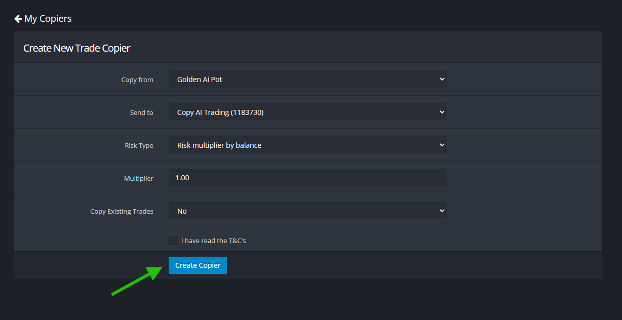 The core feature of copy ai trading Tools is trade copying. Our trade copier is the fastest copier in the market with an average replication speed of 50ms. Once you have your accounts connected to the platform you can setup trade copiers. Trade copiers are highly configurable with various risk types and settings covering all scenarios.